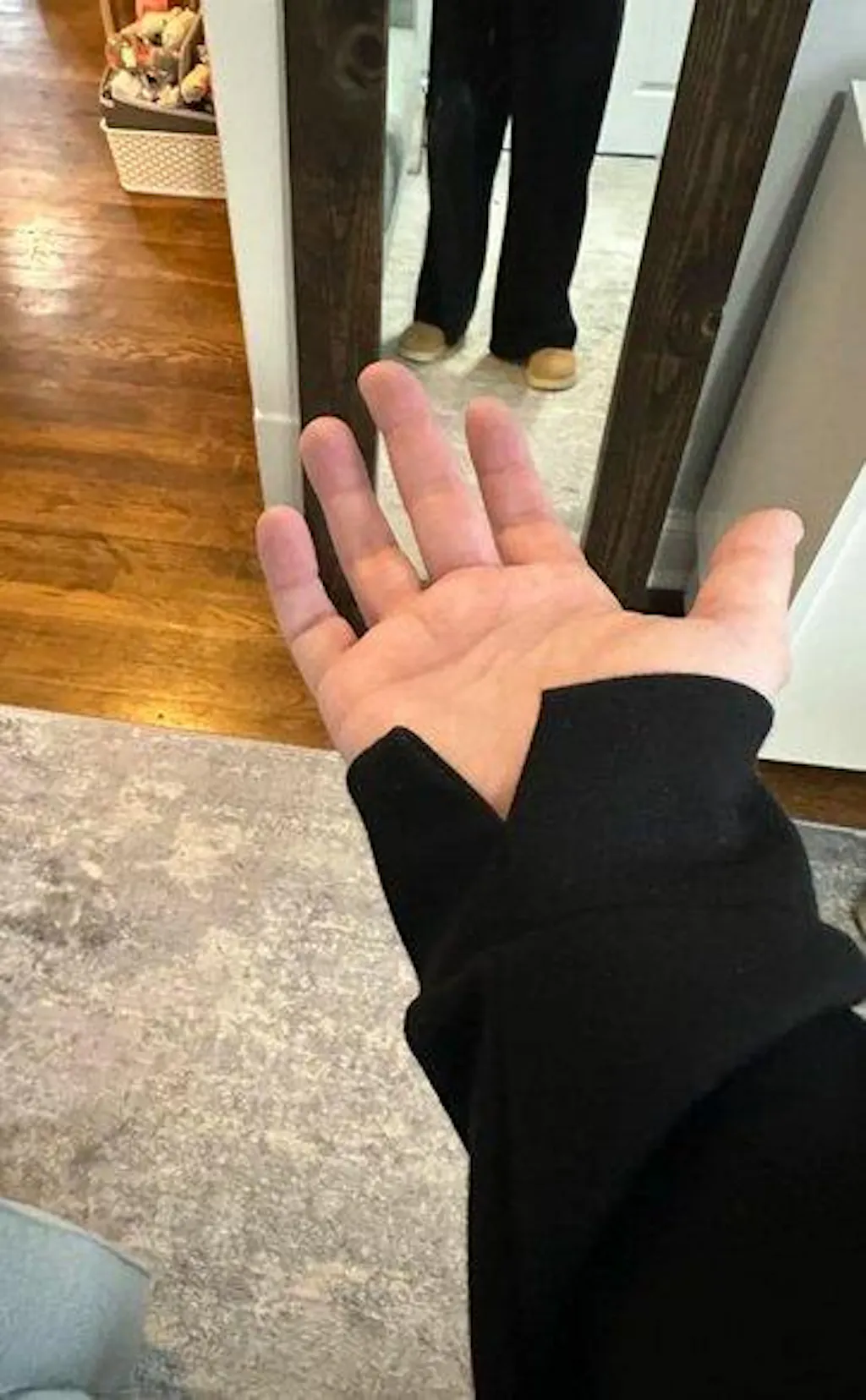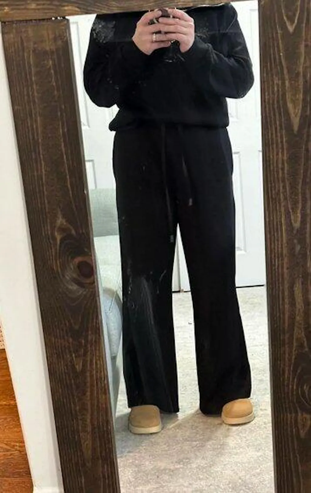 The material feels amazing!I’d say it’s a bit oversized but it looks to me like it’s supposed to be more of a wide leg so it seems pretty accurate IMO. I love this set and want it more colors!