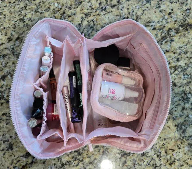 First of all this bag is soooo cute and it seems to be easy to clean the outside. The zipper is amazing, it opens and closes so easy. AND THE SPACE. i’ve had many makeup bags including that viral 3pc set, but this is the only one that holds all my makeup. PLUS it organizes it so well. I will say that if you stuff it it won’t stand up how it’s supposed to very will but that’s no big deal for me.